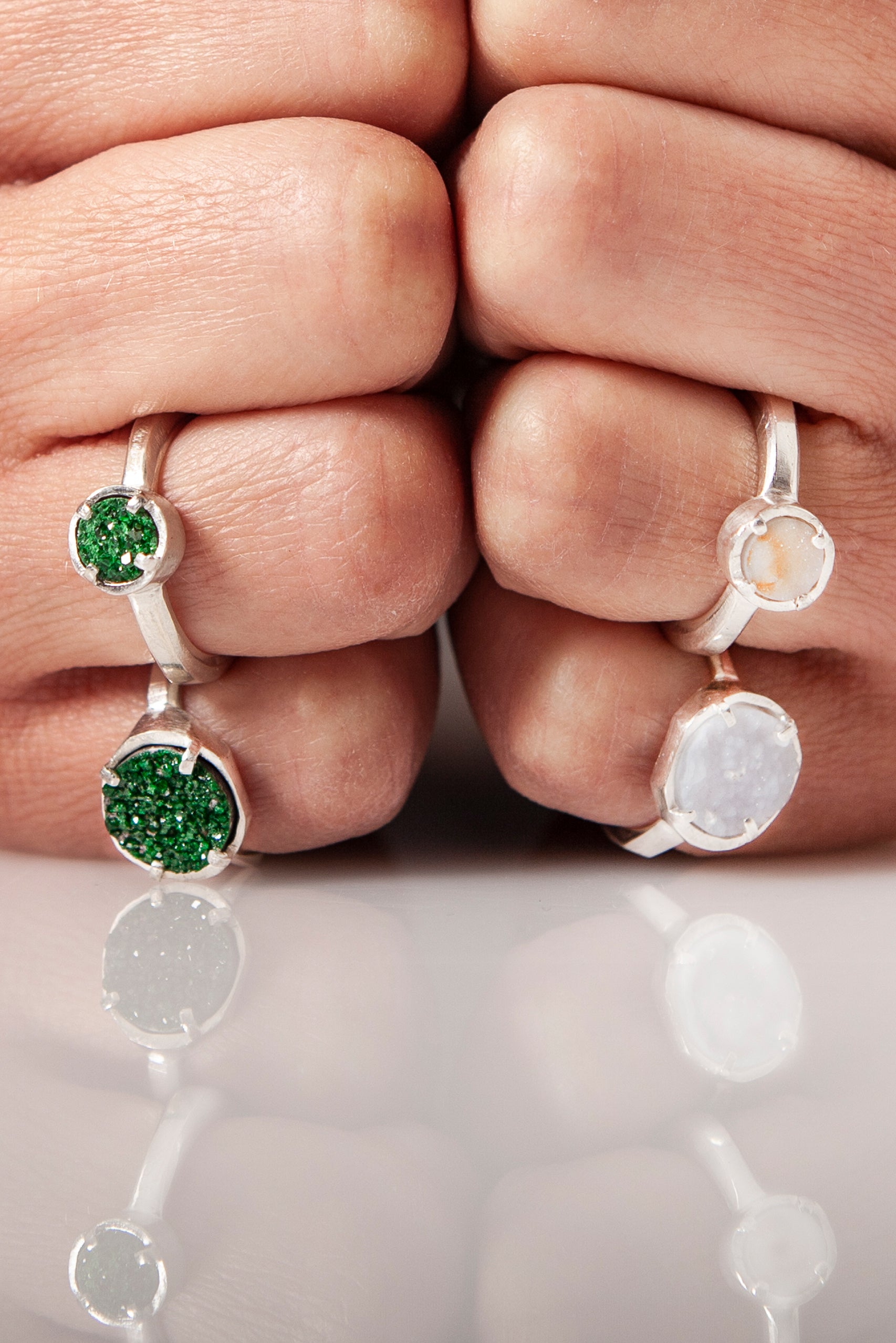 DRUSAS collection consists of a limited number of 925 sterling silver pieces, produced in small quantities. It was created with the purpose of highlighting the natural beauty of stones in their raw crystalline state. Its design blends a classic setting with delicate geometry, adapting circular and square cuts to enhance their essence. Each crystal is carefully selected, ensuring that whoever chooses this jewel holds a unique and special amulet.